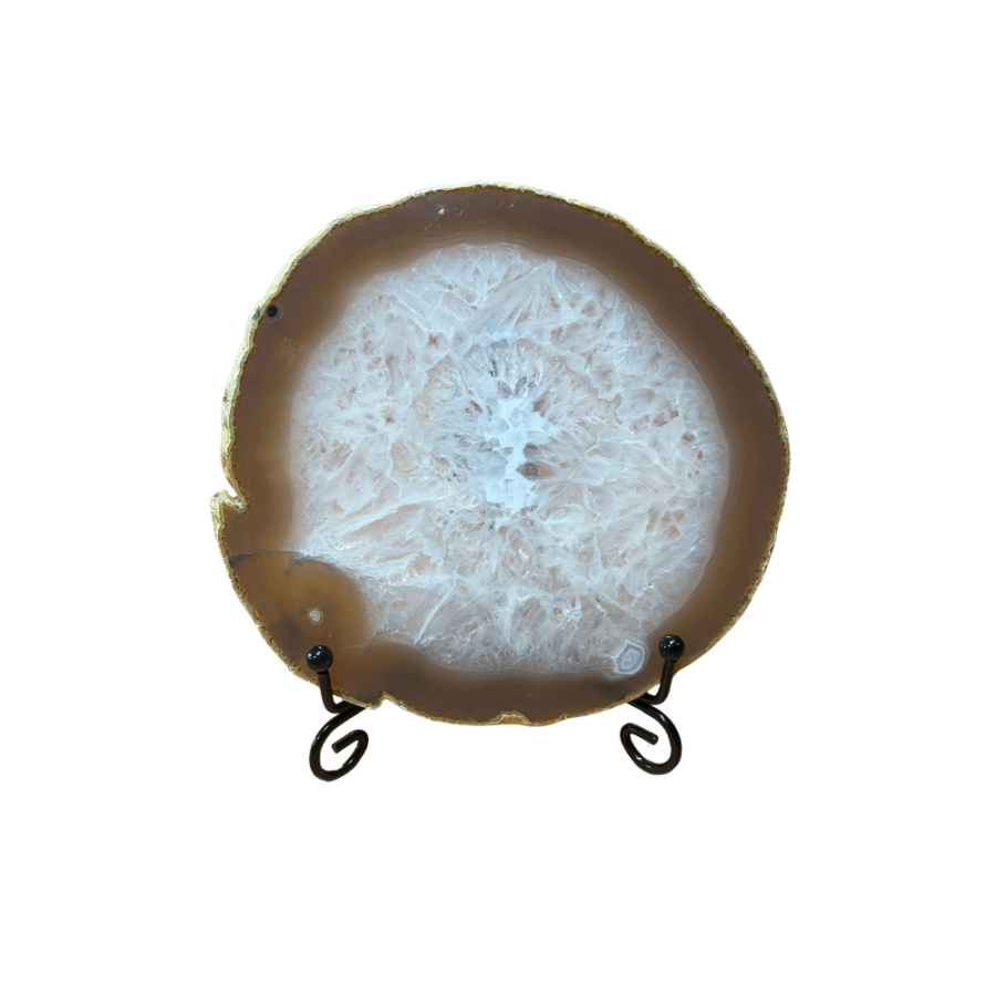 Tranche d’agate du Brésil (220 g – env. 13,5×13 cm), livrée avec support.