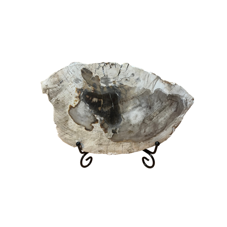 Tranche de bois fossile de Madagascar (1150 g – env. 21×13,5×4 cm), livrée avec support. Pièce unique idéale en décoration et lithothérapie.