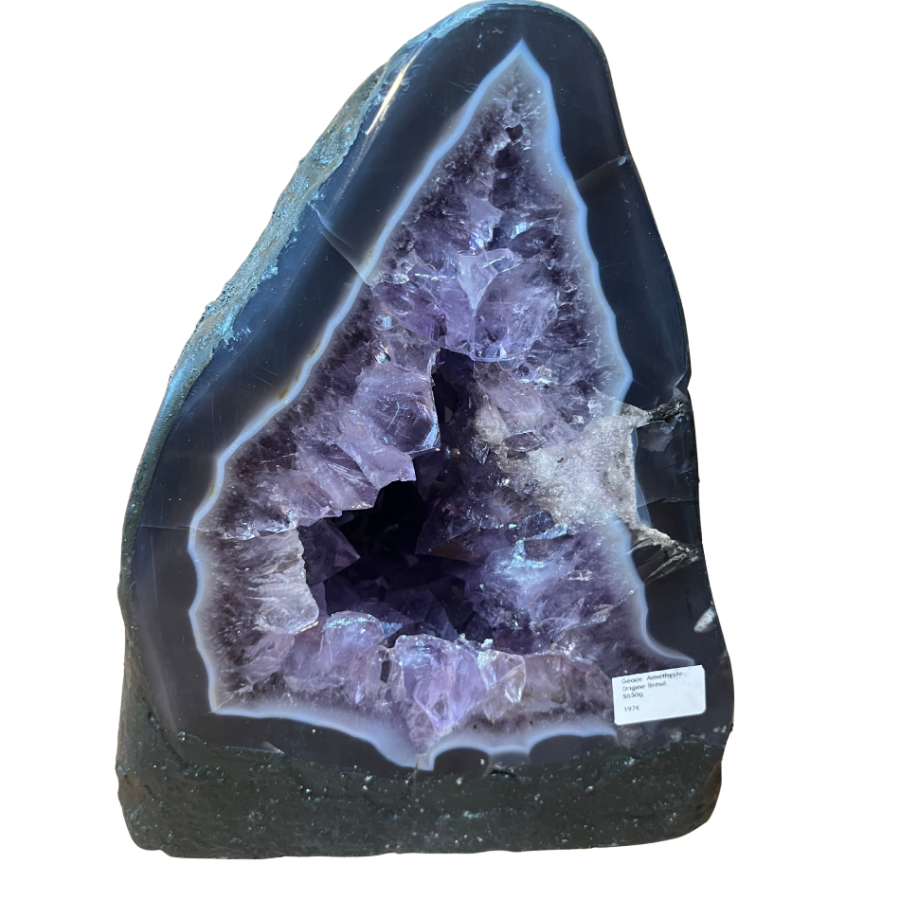 Cette géode d’améthyste de 5,65 kg provient du Brésil, pays reconnu pour la qualité et la beauté de ses cristaux.