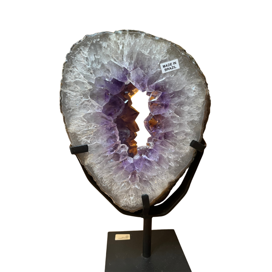 Cette tranche d’améthyste provient du Brésil, pays réputé pour la beauté et la richesse de ses minéraux.